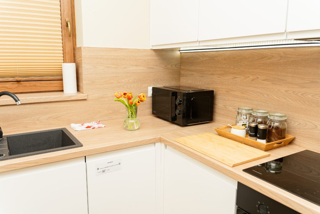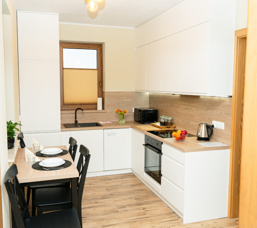 - w pełni wyposażona kuchnia (płyta grzewcza, czajnik, mikrofalówka, lodówka z zamrażalnikiem, zmywarka, przybory kuchenne, płyn do naczyń, ścierki, kostki do zmywarki) ze stołem i krzesłami,