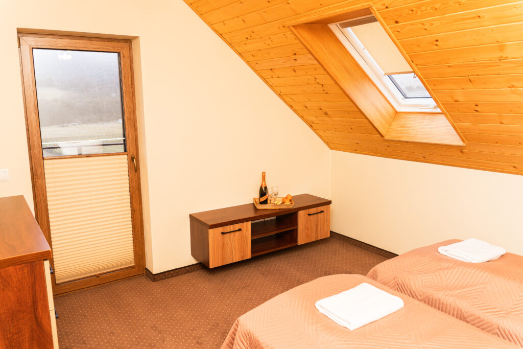- druga sypialnia to dwa pojedyncze łóżka (90×200 cm), komoda oraz balkon z widokiem na okolicę.