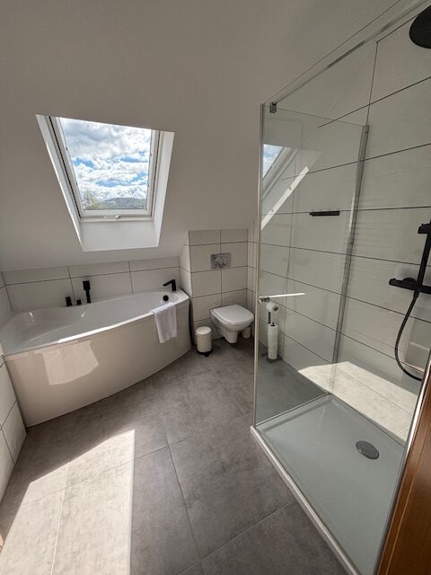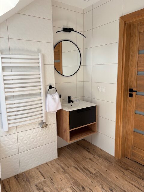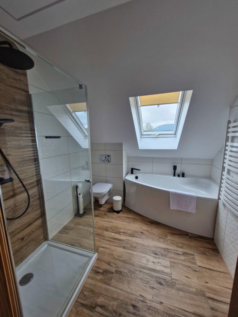 Na poddaszu czekają dwie komfortowe sypialnie oraz elegancka łazienka z wanną i prysznicem:
