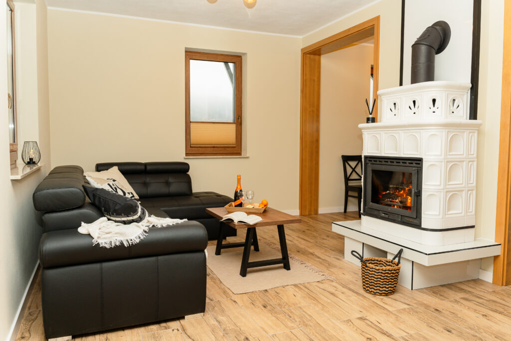 - salon z rozkładaną sofą dla dwóch osób, telewizorem i klimatycznym kominkiem,