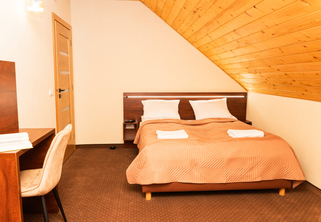 - pierwsza sypialnia wyposażona jest w duże łóżko małżeńskie (160×200 cm), szafę, biurko, telewizor i wyjście na balkon,