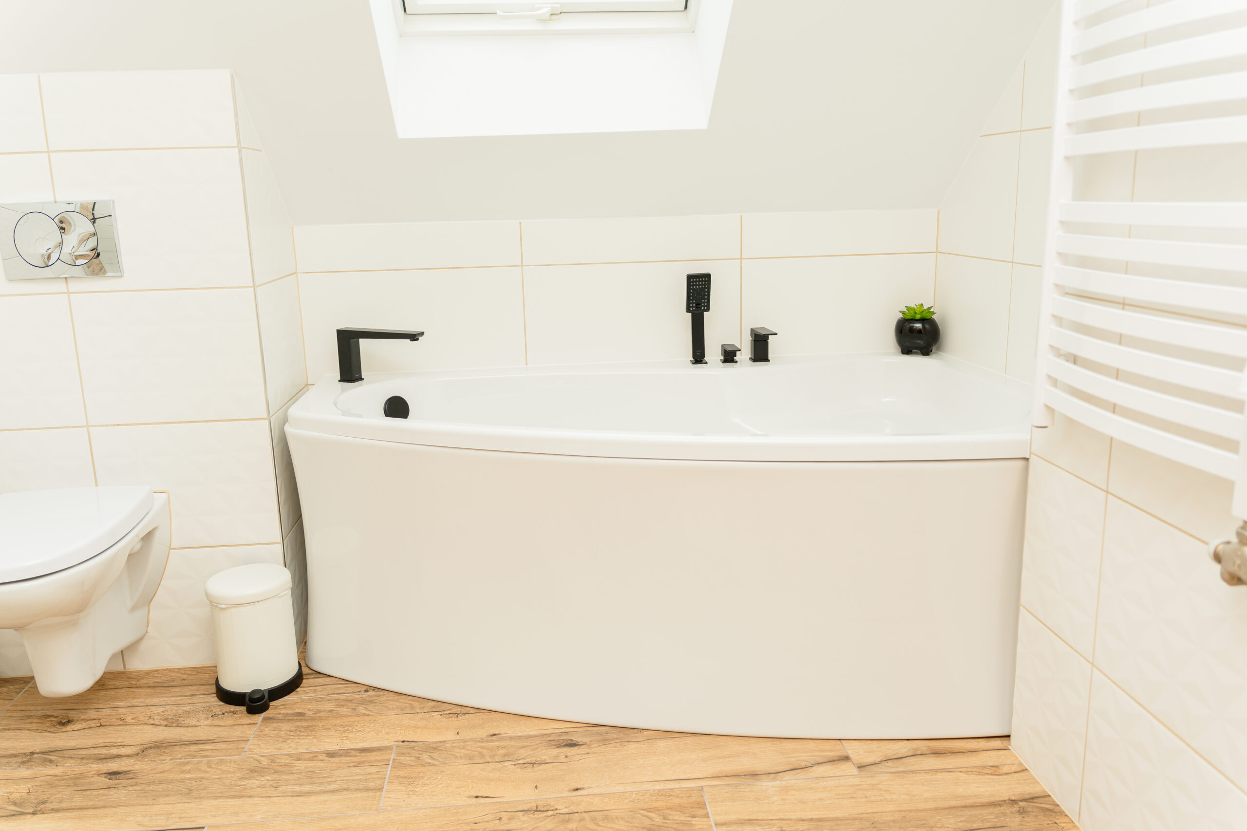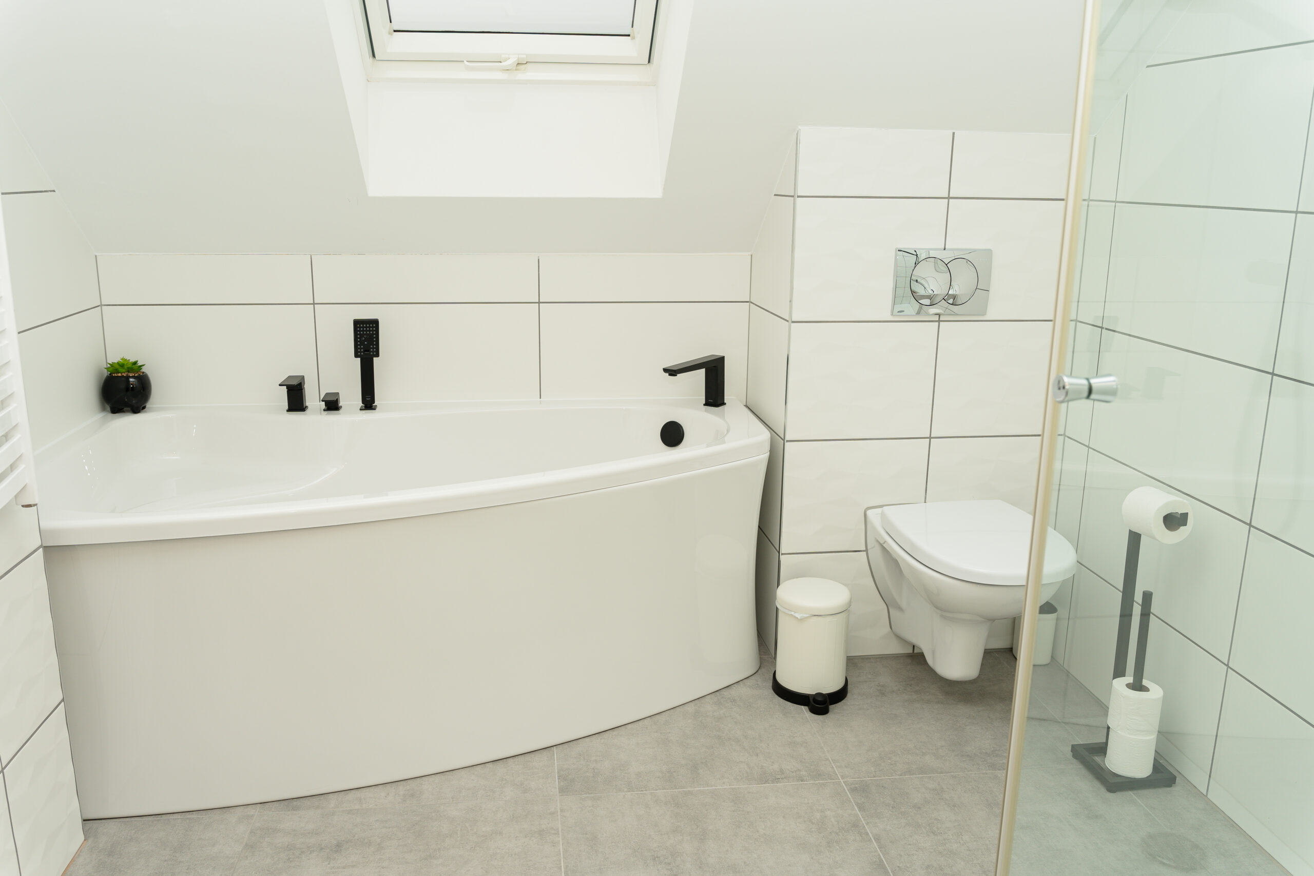 Na poddaszu czekają dwie komfortowe sypialnie oraz elegancka łazienka z wanną i prysznicem: