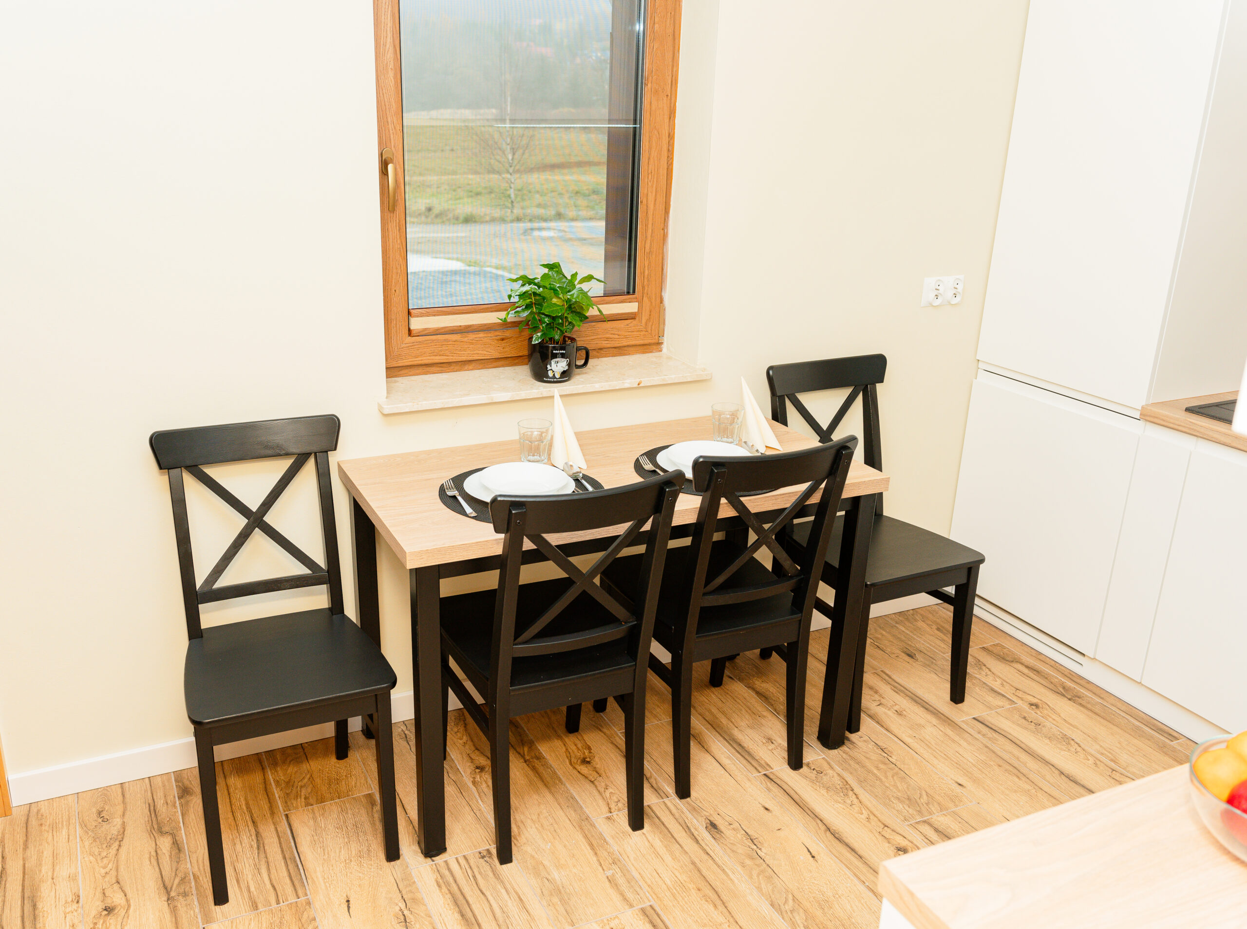- w pełni wyposażona kuchnia (płyta grzewcza, czajnik, mikrofalówka, lodówka z zamrażalnikiem, zmywarka, przybory kuchenne, płyn do naczyń, ścierki, kostki do zmywarki) ze stołem i krzesłami,