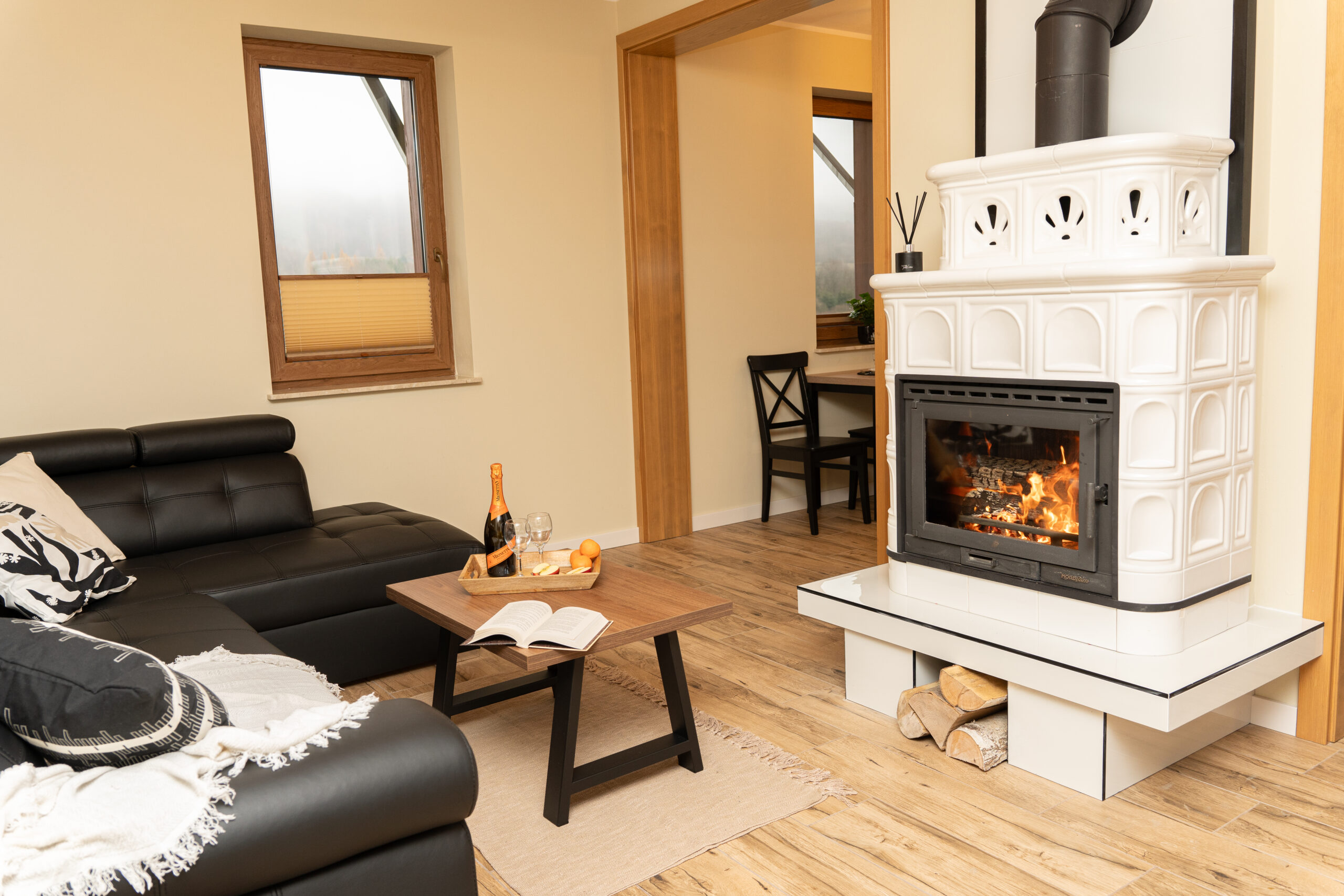- salon z rozkładaną sofą dla dwóch osób, telewizorem i klimatycznym kominkiem,
