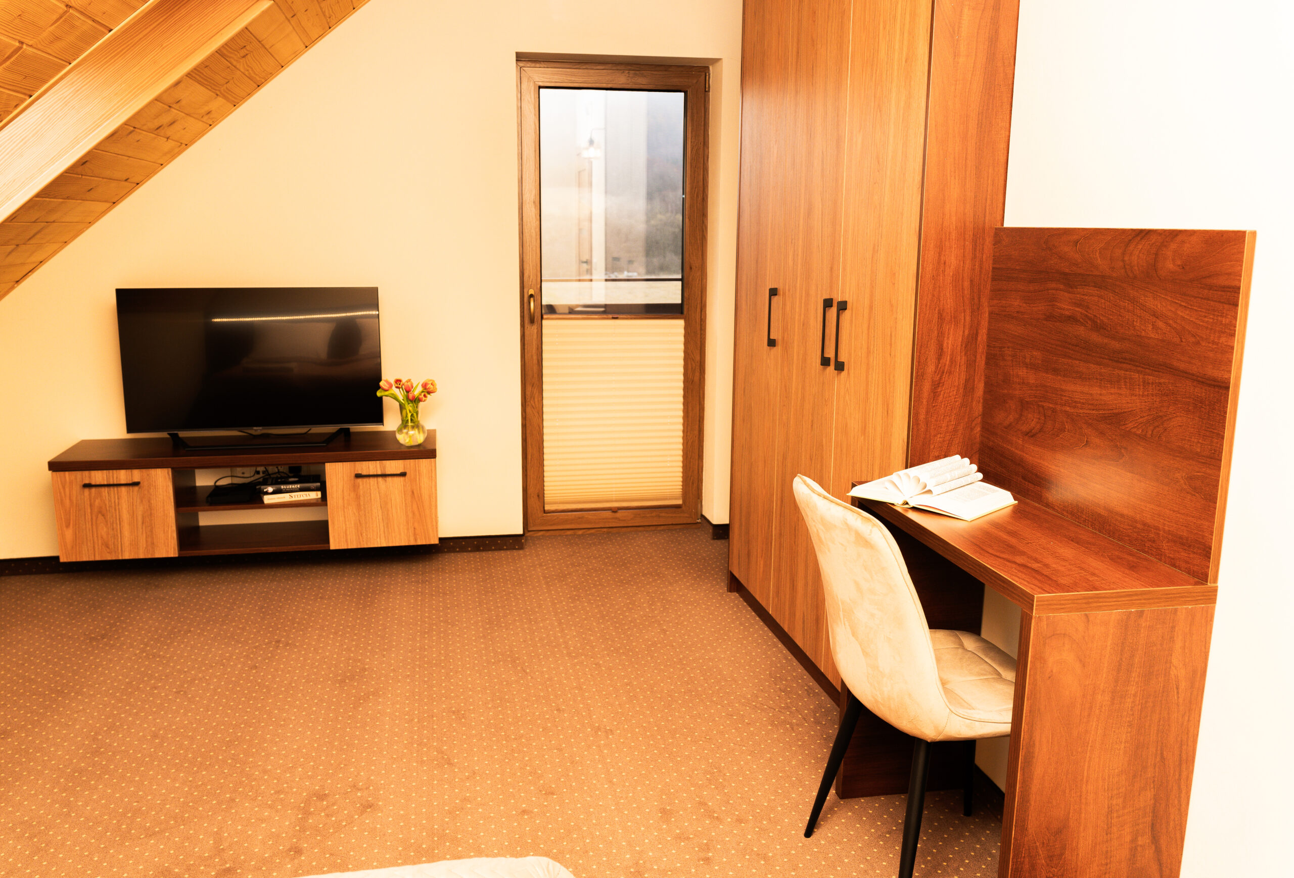 - pierwsza sypialnia wyposażona jest w duże łóżko małżeńskie (160×200 cm), szafę, biurko, telewizor i wyjście na balkon,